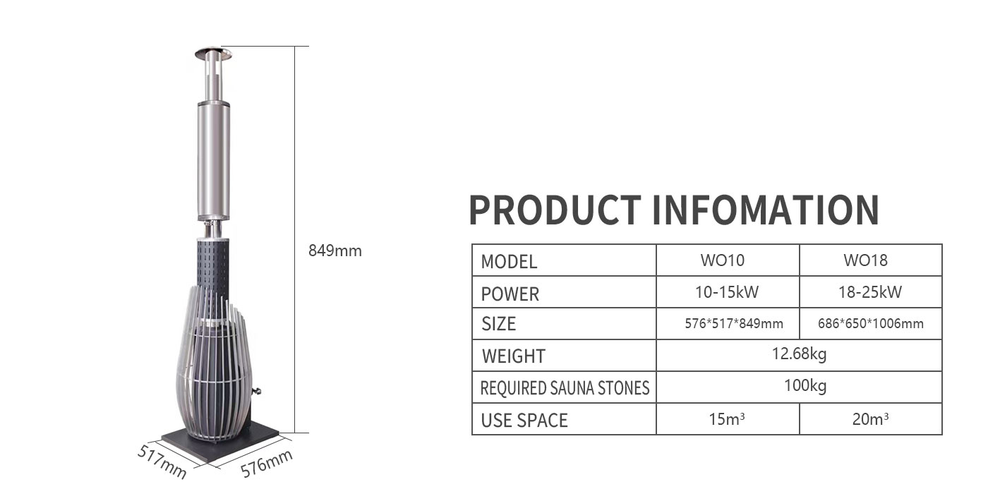 stone enclosure design is made of high-quality solid stainless steel, which not only effectively protects the sauna stones from burns but also evenly and efficiently transfers the heat of the firewood to every inch of the sauna room, providing a warm and comfortable sauna experience.